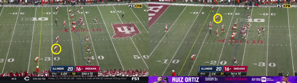 Given 11 or 20, the Illini sub in a linebacker into the box to the tight end side, or move Sydney Brown (30) to that spot.