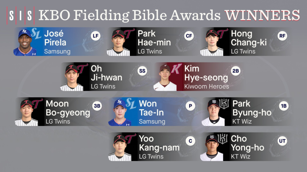 Two former major leaguers won a Fielding Bible Award. First baseman Park Byung-ho, who played for the Twins in 2016, won in his first season with the KT Wiz, for whom he also hit 35 home runs. And left fielder José Pirela, who also had a great offensive season, was one of two winners on the Samsung Lions along with pitcher Won Tae-in. Pirela formerly played in the majors from 2014 to 2019 for the Yankees, Padres, and Phillies.