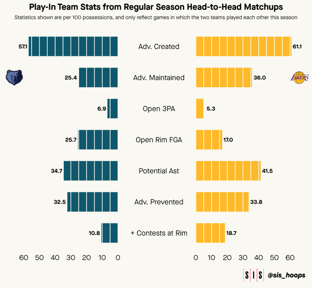 To keep the Grizzlies away from the rim, the Lakers will need to contain Ja Morant who is 5th in the NBA in Advantage Creation (32.9). They have the personnel to help prevent advantages with Anthony Davis (95th Percentile) and Jarred Vanderbilt (78th Percentile), but containing Ja will be a team effort.