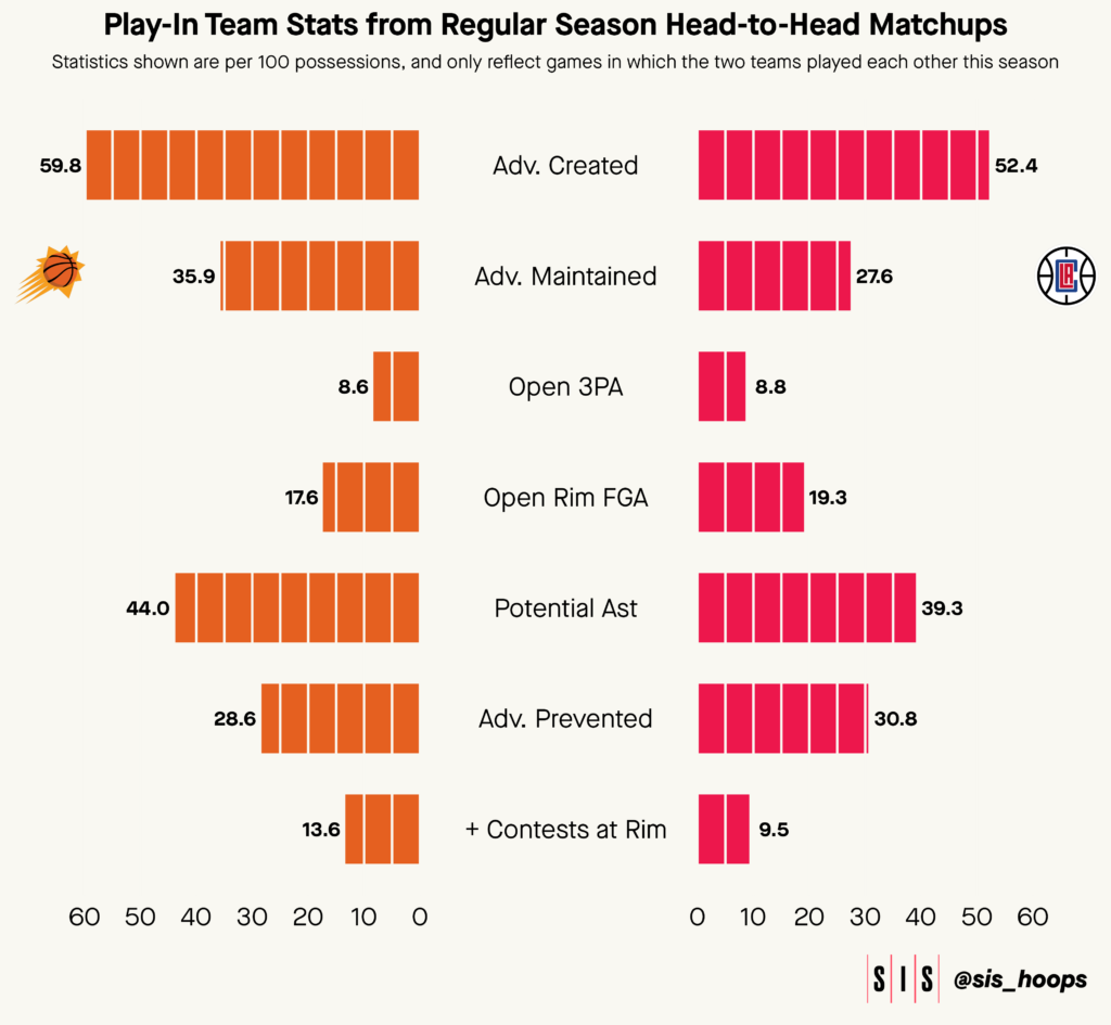 Given the talent on these teams, it is no surprise that they both rank in the Top 10 in Advantage Creation (Phoenix 10th at 75.4 and Los Angeles 4th at 78.4); however, losing Paul George to a knee sprain, who averages 21.8 Advantages Created Per 100 (12th in the among all players), leaves a big hole for the Clippers to fill.