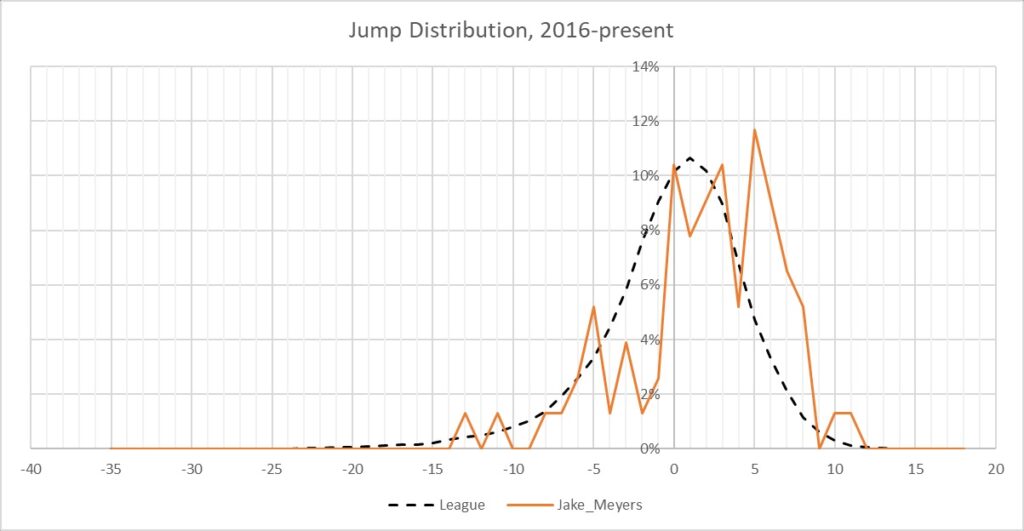 The orange line shows the frequency with which Meyers gets a jump between -40 and +20 feet above an average CF. The black dashed line shows the MLB rates. Meyers gets jumps 4 to 8 feet better than an average outfielder much more often than an average outfielder.