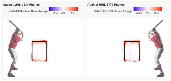 Below are heat maps showing Eddings’ strike zone tendencies the last two years (June 30, 2021 to June 29, 2023). Areas in red are those in which Eddings calls strikes more often than his peers. Areas in blue are those in which Eddings calls fewer strikes.