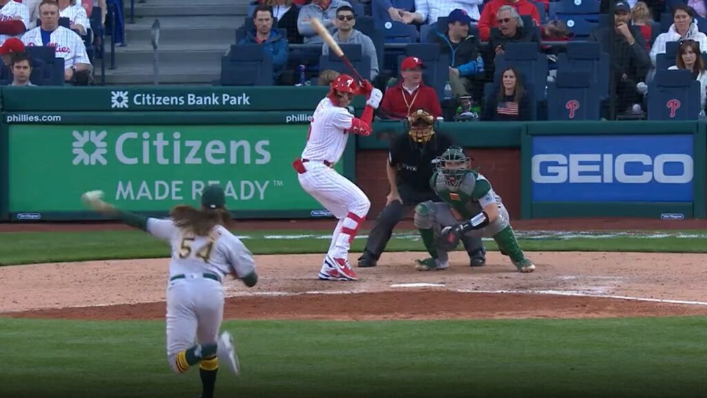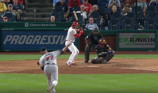 However, upon recommendation from Jean Segura and hitting coach Kevin Long (as documented by the Philadelphia Inquirer’s Alex Coffey), Stott began using a more conservative two-strike approach at all times starting in August. As seen in the second clip, Stott has crouched down significantly, lowered the angle of his hands, and kept his feet quieter by loading with an exaggerated rock and lean.