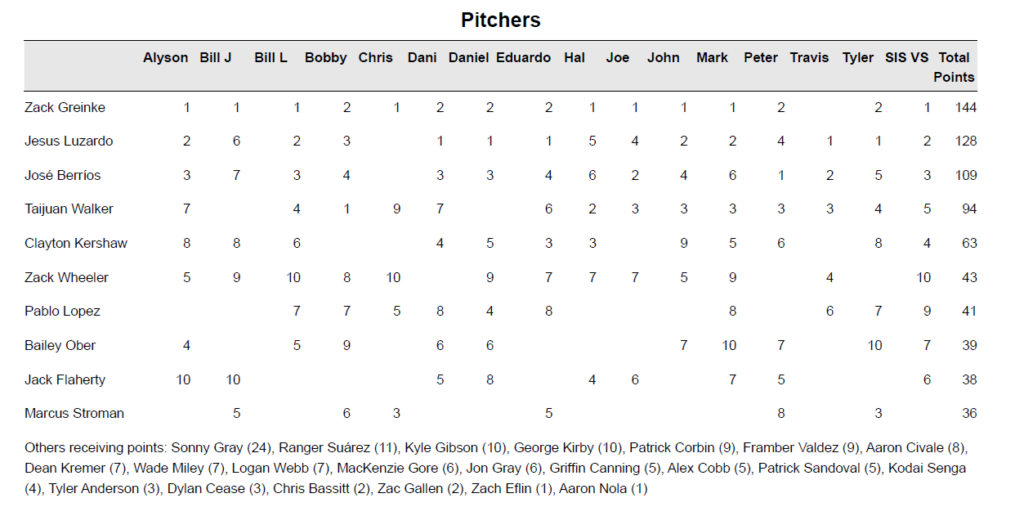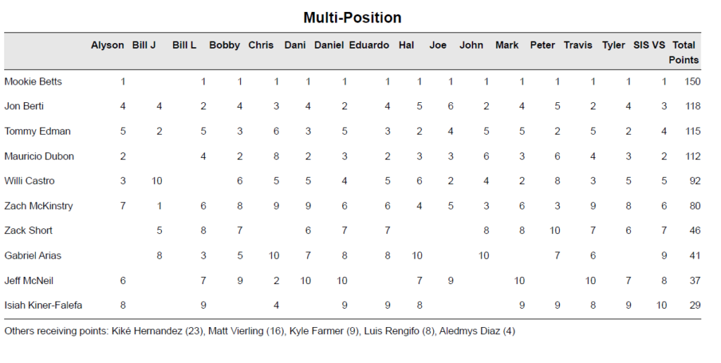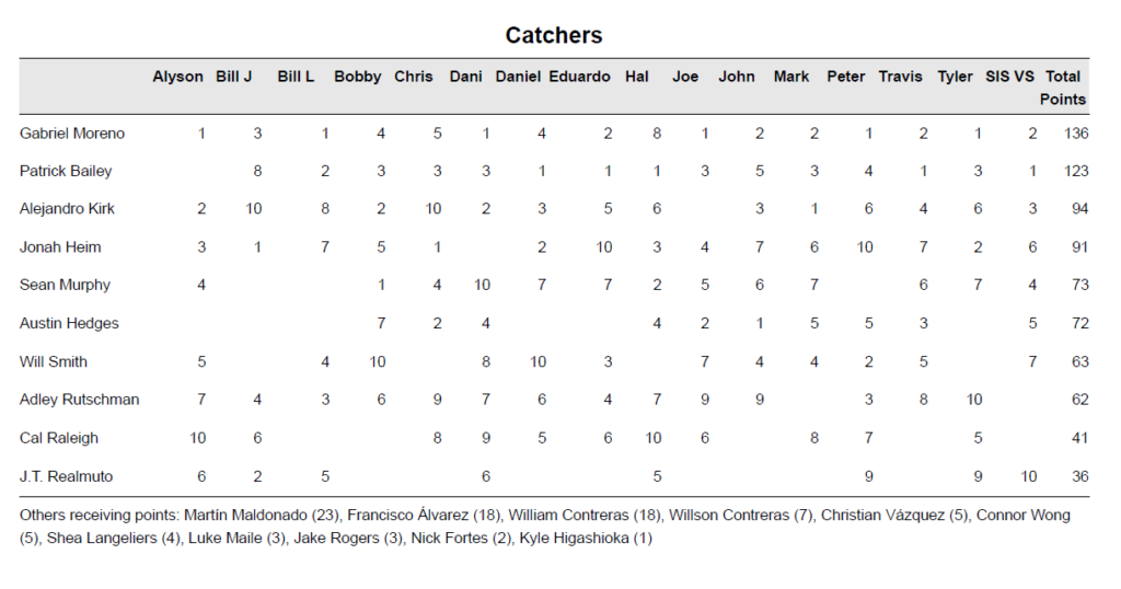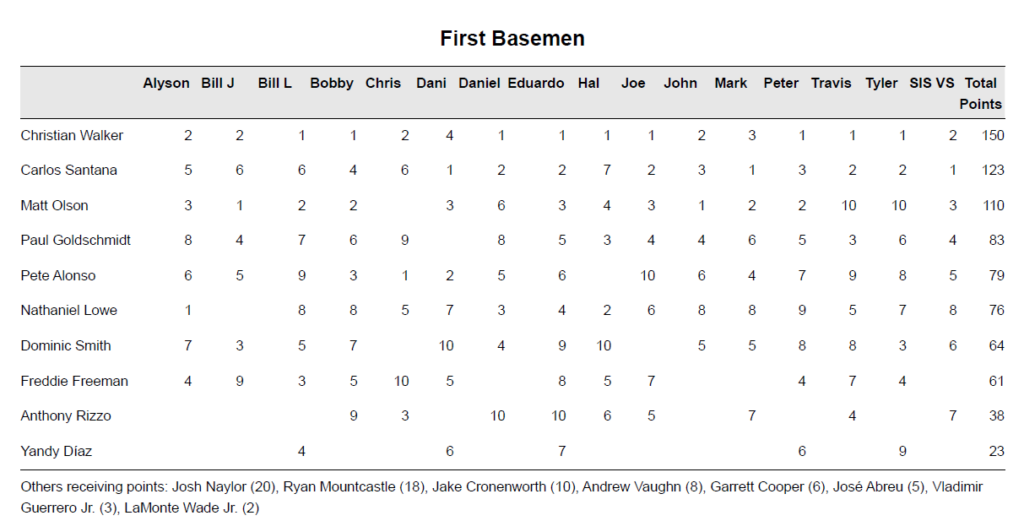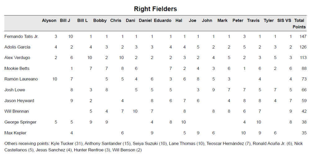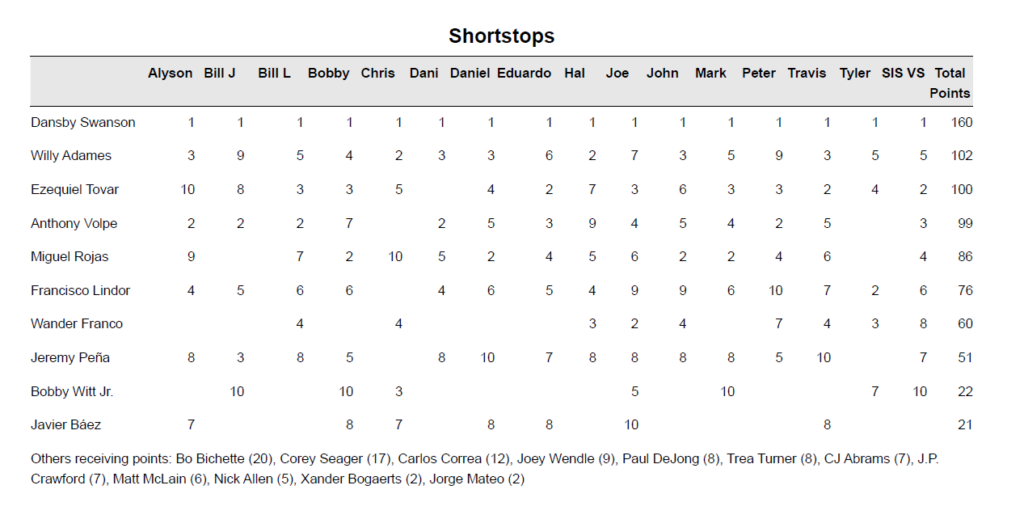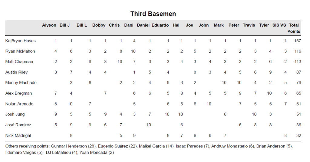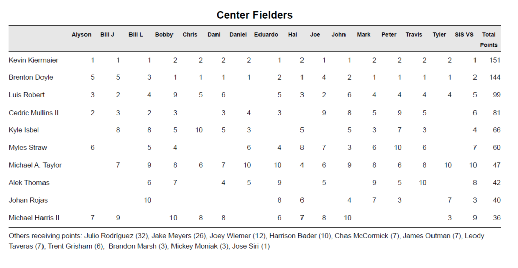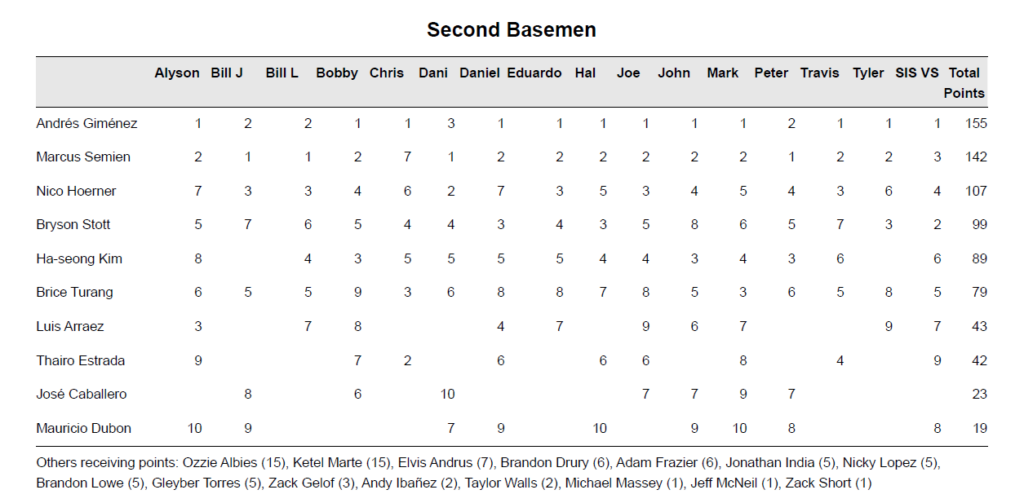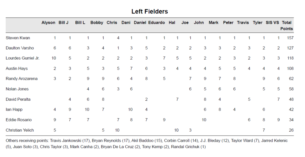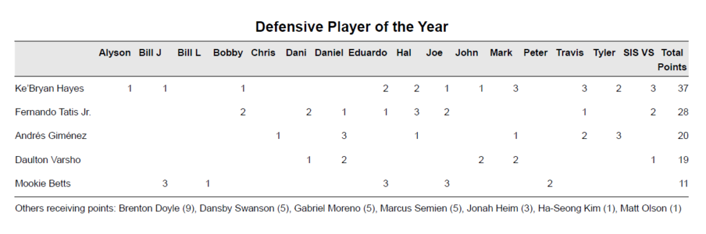 In 2023, we added an award for Defensive Player of the Year. All players eligible for a Fielding Bible Award can be voted on for this award. All voters ranked players from 1 to 3, with 5 points for a first place vote, 3 for a second place vote, and 1 for a third place vote.