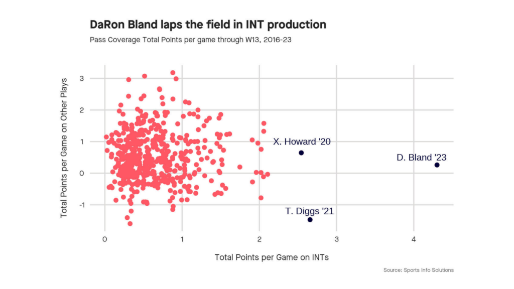 Bland is generating more than six points per interception (and return), which is insane. That’s like if he scored eight 90-yard touchdowns as a receiver.