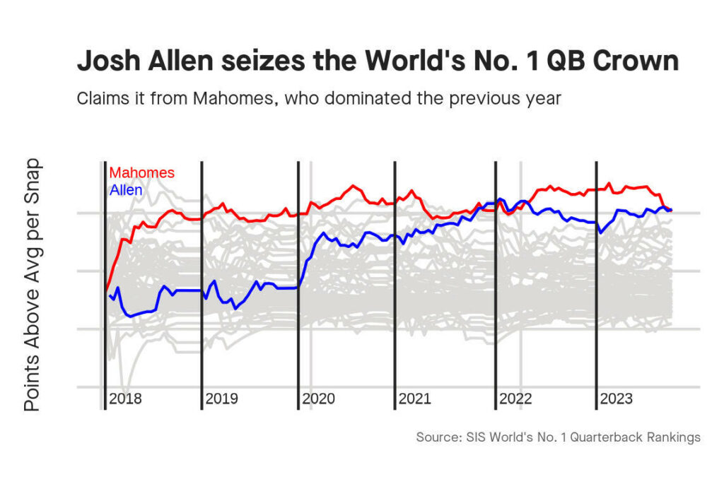 It took the entire season for Allen to supplant Mahomes for the No. 1 spot in our statistical ranking system but it finally happened when, with Mahomes sitting out, Allen threw for 359 yards and 2 touchdowns and ran for 67 more yards in a division-clinching win over the Dolphins.