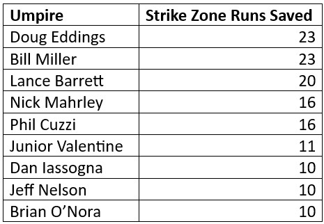 Here are the umpires with the most Strike Zone Runs Saved since the start of the 2022 season. You can think of them as umpires who tend to call a good deal more strikes than expected when looking at all MLB umpires’ strike-calling tendencies.