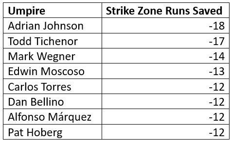 This allows us to gauge an umpire’s tendency to call more or fewer strikes than expected. An umpire who calls a lot more strikes than expected has a high Strike Zone Runs Saved total.