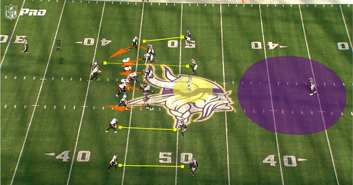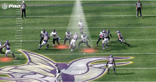 On the right, Harrison Smith (#22) and Jonathan Greenard (#58) collided with the running back and left tackle and used their impact to switch assignments.