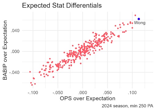 And when we compare Wong’s actual and expected stats, there are big differences. Wong had a .758 OPS and a .645 expected OPS. His OPS differential between his real and expected numbers was 113 points, the biggest difference for any player with at least 250 plate appearances in 2024.