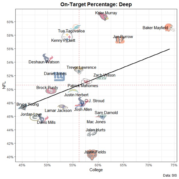 The above table shows how career college on-target percentage at different depths predicts NFL on-target percentage in the first 2 to 3 years (at least 2 years and 300 passing attempts, at most 3 years). SIS started tracking college football in 2016 and 22 quarterbacks qualified by these criteria since then.