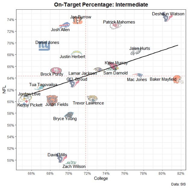 When observing the graph above, there are other interesting bits of information to take away. Let’s take a moment to compare Josh Allen and Zach Wilson. Both came out of college being described as boom-or-bust prospects with big arms and a penchant for big plays, but questionable accuracy, decision making, and reliance on hero ball at times. We can see that in college they had similar accuracy on short throws (and intermediate throws as well, as seen in the graph below), but at the next level Allen has been able to deliver accuracy above expectations while Wilson’s accuracy has been underwhelming. This offers insight on one potential factor out of many for why their careers have taken different directions.
