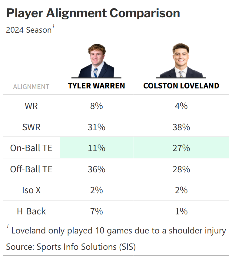 As you can see, Loveland spent more time lined up as a traditional tight end, but the rates at which they moved out wide (including as an X) or into the slot were pretty similar (41% for Warren, 44% for Loveland). It’s also worth noting that the on-ball and off-ball splits are meaningfully different, particularly because they speak to the types of blocks these players were being asked to execute, which we’ll return to in a moment.