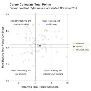 Warren and Loveland are very talented and at this point it should be clear that team fit may be more important than anything in terms of who comes off the board first. However, we can still tie this off with a general statistical comparison of Loveland and Warren to both each other and tight ends who have been drafted since 2016: