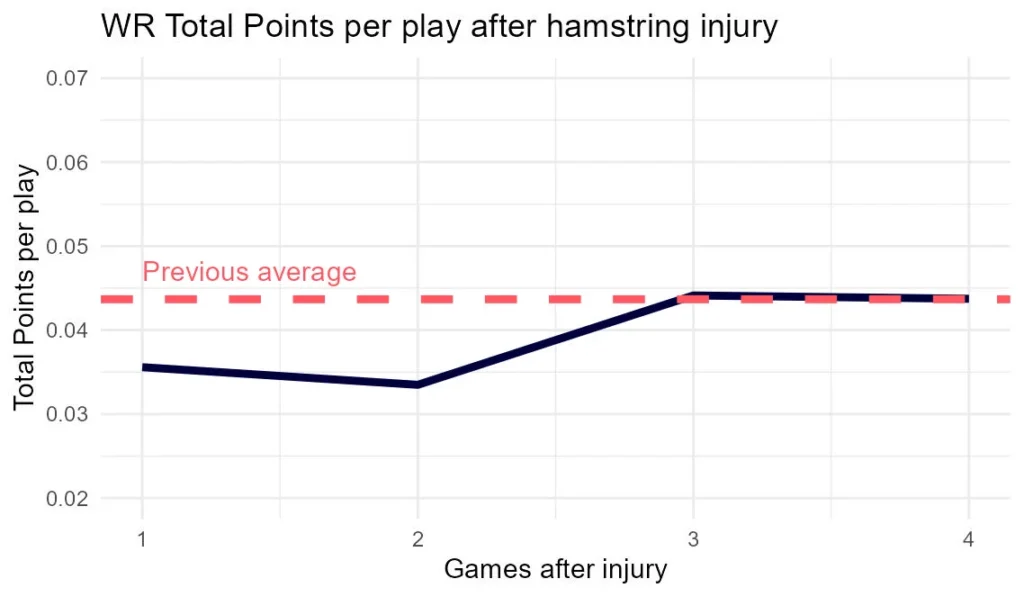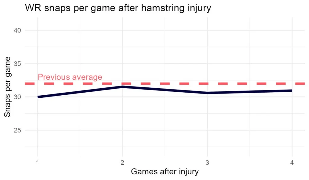 I looked at about 30 wide receiver hamstring injuries over the last several seasons and how much/well they played upon their return, compared to their previous year’s average.